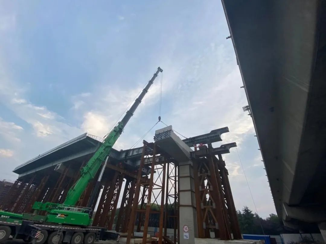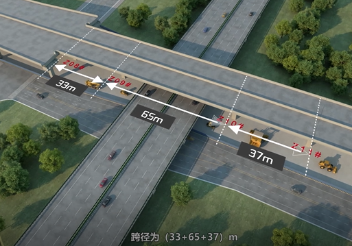 據(jù)悉,高鐵新城快速路連接線是524國(guó)道的重要組成部分,也是蘇州市快速路東環(huán)放射線北延伸段,該項(xiàng)目采用全線高架+地面輔路的敷設(shè)形式,路線全長(zhǎng)約1.8公里,其中8#-11#為(33+65+37)m三跨等高連續(xù)鋼箱梁,主跨上跨繞城高速,梁高2.5m,橫斷面為單箱三室結(jié)構(gòu),總寬度26m,總重量2051噸。