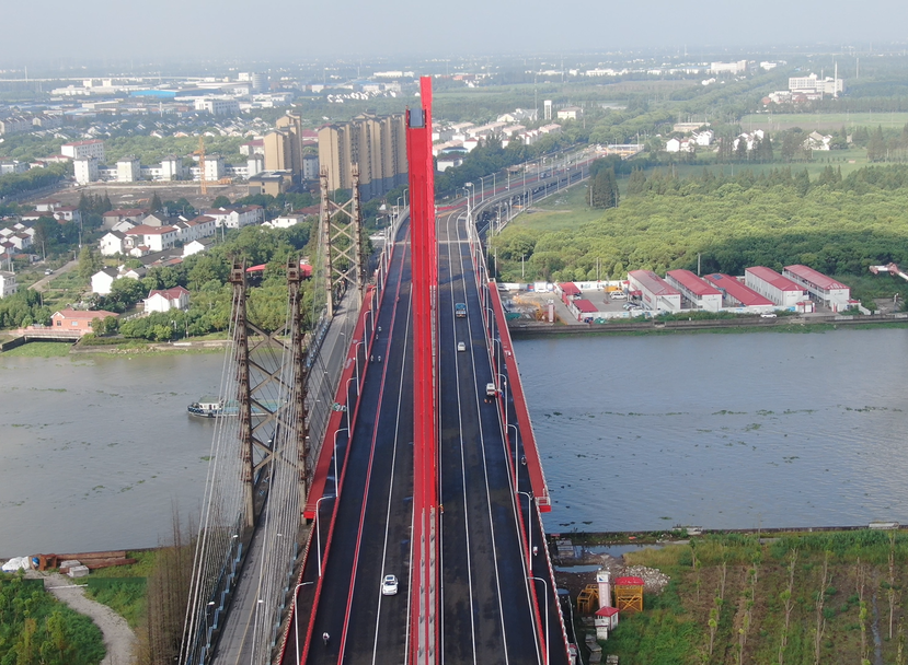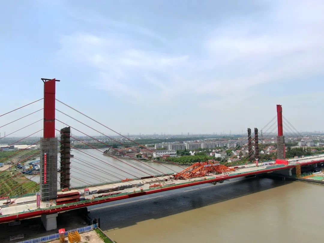 葉新公路泖港大橋工程位于上海市松江區(qū)泖港鎮(zhèn),線路為東西走向,新建泖港大橋于2018年4月動工興建,主橋一跨過河、采用鋼塔鋼箱梁平行單索面斜拉橋,塔梁固接、塔墩分離體系,主橋跨徑445米,其中主跨225米,主塔高60米,主跨寬38.5m,為一級公路,雙向6車道及人行道、非機(jī)動車道。此前,2020年5月20日,新建泖港大橋?qū)崿F(xiàn)主橋合龍。